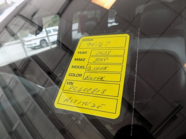 2023 Jeep Grand Cherokee Altitude Silver Zynith 3.6L V6 24V VVT RWD CARFAX One-Owner. Clean CARFAX. Odometer is 7166 miles below market average! 115V Auxiliary Power Outlet, 4-Wheel Disc Brakes, ABS brakes, Alloy wheels, Altitude Appearance Package, Automatic temperature control, Black Headliner, Capri Leatherette/Suede Seats, Delete Laredo Badge, Emergency communication system, Front anti-roll bar, Front dual zone A/C, Fully automatic headlights, Gloss Black Exterior Accents, Heated door mirrors, Heated Front Seats, Heated Steering Wheel, Molded In Color Black/Gloss Black Roof Rails, MOPAR Finishing Package, MOPAR Front Splash Guards, MOPAR Paint Protection Film, MOPAR Rear Splash Guards w/Jeep Logo, Outside temperature display, ParkView Rear Back-Up Camera, Power door mirrors, Power driver seat, Power Liftgate, Power Sunroof (DISC), Power windows, Quick Order Package 23B Altitude, Radio: Uconnect 5 w/8.4" Display, Rain Sensitive Windshield Wipers, Rear anti-roll bar, Remote keyless entry, Remote Start System, Security system, Selectable Tire Fill Alert, Speed-Sensitive Wipers, Split folding rear seat, Spoiler, Steering wheel mounted audio controls, Wheels: 18" x 8" Fully Painted Aluminum 1, Wireless Charging Pad, 3.45 Rear Axle Ratio, 6 Speakers, Air Conditioning, Anti-whiplash front head restraints, Brake assist, Bumpers: body-color, Cloth Seats, Compass, Delay-off headlights, Driver door bin, Driver vanity mirror, Dual front impact airbags, Dual front side impact airbags, Electronic Stability Control, Four wheel independent suspension, Front Bucket Seats, Front Center Armrest w/Storage, Front License Plate Bracket, Front reading lights, Illuminated entry, Knee airbag, Low tire pressure warning, MOPAR Black Side Steps, Normal Duty Suspension, Occupant sensing airbag, Overhead airbag, Overhead console, Panic alarm, Passenger door bin, Passenger vanity mirror, Power steering, Radio data system, Rear reading lights, Rear window defroster, Rear window wiper, Speed control, Tachometer, Telescoping steering wheel, Tilt steering wheel, Traction control, Trip computer, Variably intermittent wipers, Voltmeter, Wheels: 17" x 6.5" Fully Painted Aluminum, Wheels: 20" x 8.5" Gloss Black Painted Aluminum, 115V Auxiliary Power Outlet, 4-Wheel Disc Brakes, ABS brakes, Alloy wheels, Altitude Appearance Package, Automatic temperature control, Black Headliner, Capri Leatherette/Suede Seats, Delete Laredo Badge, Emergency communication system, Front anti-roll bar, Front dual zone A/C, Fully automatic headlights, Gloss Black Exterior Accents, Heated door mirrors, Heated Front Seats, Heated Steering Wheel, Molded In Color Black/Gloss Black Roof Rails, MOPAR Finishing Package, MOPAR Front Splash Guards, MOPAR Paint Protection Film, MOPAR Rear Splash Guards w/Jeep Logo, Outside temperature display, ParkView Rear Back-Up Camera, Power door mirrors, Power driver seat, Power Liftgate, Power Sunroof (DISC), Power windows, Quick Order Package 23B Altitude, Radio: Uconnect 5 w/8.4" Display, Rain Sensitive Windshield Wipers, Rear anti-roll bar, Remote keyless entry, Remote Start System, Security system, Selectable Tire Fill Alert, Speed-Sensitive Wipers, Split folding rear seat, Spoiler, Steering wheel mounted audio controls, Wheels: 18" x 8" Fully Painted Aluminum 1, Wireless Charging Pad.