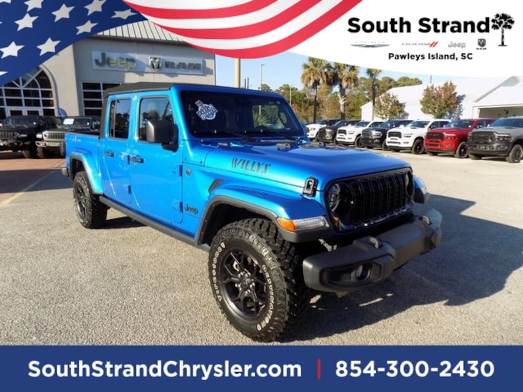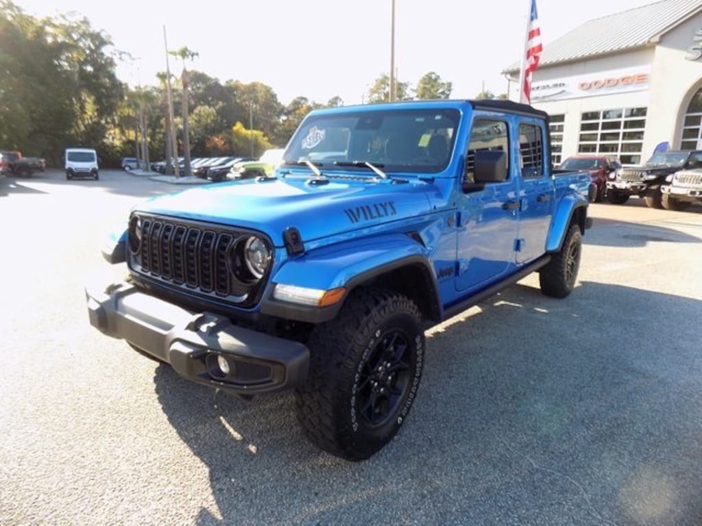 2024 Jeep Gladiator Willys 4X4 Hydro Blue Pearlcoat 3.6L V6 24V VVT 4WD CARFAX One-Owner. Clean CARFAX. 110 MPH Vehicle Max Speed Calibration, 12.3" Touchscreen Display, 240 Amp Alternator, 4-Wheel Disc Brakes, 4-Wheel Drive Decal, 4G LTE Wi-Fi Hot Spot, 97 MPH Vehicle Max Speed Calibration, ABS brakes, Advanced Brake Assist, Air Conditioning w/Auto Temperature Control, Alexa Built-In, Apple CarPlay, Apple CarPlay/Android Auto, Automatic Headlamps, Auxiliary Switches, Black Grille, Body Color Fender Flares (2-Piece), Class IV Receiver Hitch, Cluster 7.0" TFT Color Display, Daytime Running Lamps LED Accents, Deep Tint Sunscreen Windows, E-Locker Rear Axle, Emergency communication system: Jeep Connect, Enhanced Adaptive Cruise Control, Front 1-Touch Down Power Windows, Front anti-roll bar, Front Door Locks 2-Door Passive Entry, Front fog lights, Front Heavy Duty Red Accent Shock Absorbers, Front LED Fog Lamps, Full Speed Forward Collision Warning Plus, Heavy-Duty Engine Cooling, Integrated roll-over protection, LED Premium Reflector Headlamps, LED Taillamps, Mold In Color Bumper w/Gloss Black, MOPAR All-Weather Slush Mats, MOPAR Spray In Bedliner, Off-Road Plus Mode, Outside temperature display, ParkView Rear Back-Up Camera, Power Heated Mirrors, Power Tailgate Lock, Premium Wrapped Steering Wheel, Protection Sill Rails, Quick Order Package 24W Willys, Radio: Uconnect 5 w/12.3" Display, Rear anti-roll bar, Rear Heavy Duty Red Accent Shock Absorbers, Remote Keyless Entry, Security Alarm, Speed Sensitive Power Locks, Split folding rear seat, Steering wheel mounted audio controls, Sun Visors w/Illuminated Vanity Mirrors, Trailer Hitch Zoom, Wheels: 17" x 7.5" Painted Black, Willy's Suspension, Willys Hood Decal, 3.73 Rear Axle Ratio, 8 Speakers, Air Conditioning, AM/FM radio: SiriusXM with 360L, Brake assist, Cloth Low-Back Bucket Seats, Compass, Connectivity - US/Canada, Delay-off headlights, Disassociated Touchscreen Display, Driver door bin, Driver vanity mirror, Dual front impact airbags, Dual front side impact airbags, Electronic Stability Control, Front Bucket Seats, Front Center Armrest w/Storage, Front reading lights, Google Android Auto, Integrated Center Stack Radio, Low tire pressure warning, Normal Duty Suspension, Occupant sensing airbag, Overhead airbag, Passenger door bin, Passenger vanity mirror, Power steering, Radio data system, Rear reading lights, SiriusXM Radio Service, SiriusXM w/360L, Speed control, Tachometer, Telescoping steering wheel, Tilt steering wheel, Traction control, Trip computer, USB Host Flip, Variably intermittent wipers, Voltmeter, Wheels: 17" x 7.5" Black Steel Styled, 110 MPH Vehicle Max Speed Calibration, 12.3" Touchscreen Display, 240 Amp Alternator, 4-Wheel Disc Brakes, 4-Wheel Drive Decal, 4G LTE Wi-Fi Hot Spot, 97 MPH Vehicle Max Speed Calibration, ABS brakes, Advanced Brake Assist, Air Conditioning w/Auto Temperature Control, Alexa Built-In, Apple CarPlay, Apple CarPlay/Android Auto, Automatic Headlamps, Auxiliary Switches, Black Grille, Body Color Fender Flares (2-Piece), Class IV Receiver Hitch, Cluster 7.0" TFT Color Display, Daytime Running Lamps LED Accents, Deep Tint Sunscreen Windows, E-Locker Rear Axle, Emergency communication system: Jeep Connect, Enhanced Adaptive Cruise Control, Front 1-Touch Down Power Windows, Front anti-roll bar, Front Door Locks 2-Door Passive Entry, Front fog lights, Front Heavy Duty Red Accent Shock Absorbers, Front LED Fog Lamps, Full Speed Forward Collision Warning Plus, Heavy-Duty Engine Cooling, Integrated roll-over protection, LED Premium Reflector Headlamps, LED Taillamps, Mold In Color Bumper w/Gloss Black, MOPAR All-Weather Slush Mats, MOPAR Spray In Bedliner, Off-Road Plus Mode, Outside temperature display, ParkView Rear Back-Up Camera, Power Heated Mirrors, Power Tailgate Lock, Premium Wrapped Steering Wheel, Protection Sill Rails, Quick Order Package 24W Willys, Radio: Uconnect 5 w/12.3" Display, Rear anti-roll bar, Rear Heavy Duty Red Accent