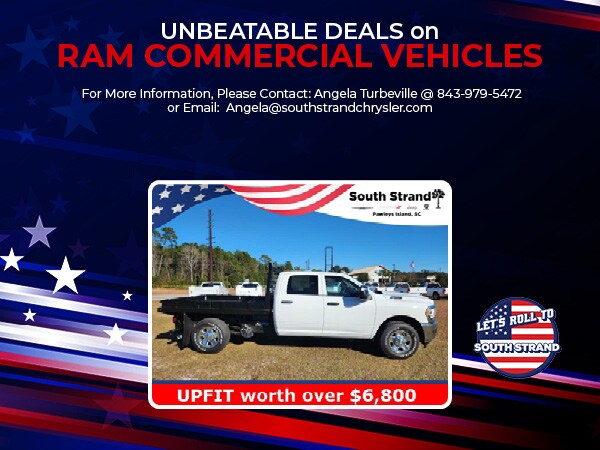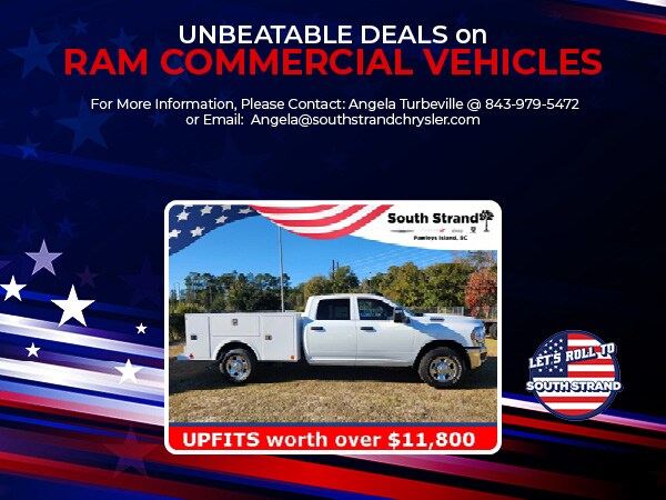 Choosing a Ram commercial truck or van at South Strand Chrysler Dodge Jeep RAM means investing in a work partner built to boost productivity and profitability. Explore our commercial vehicle inventory today and see how a customized Ram can take your business to the next level.